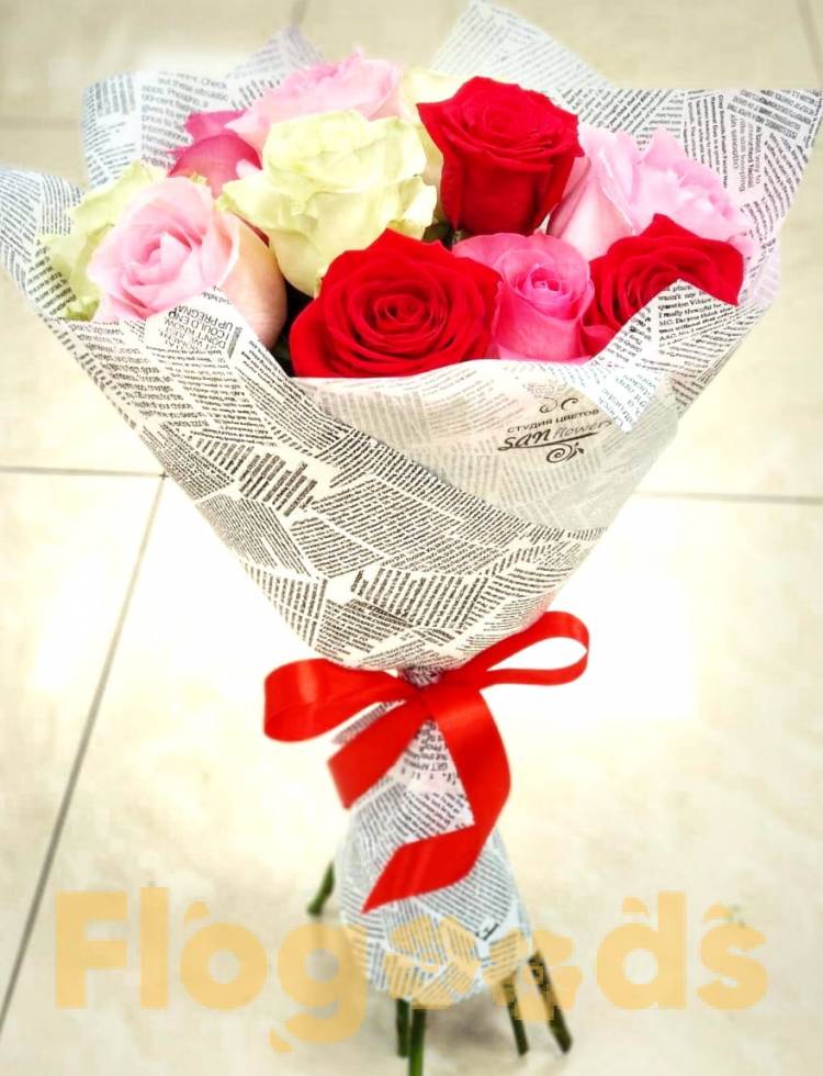 Веселый букет из разноцветных роз, отличный подарок на юбилей или День Рождение. Он принесет замечательное настроение в любой дом.